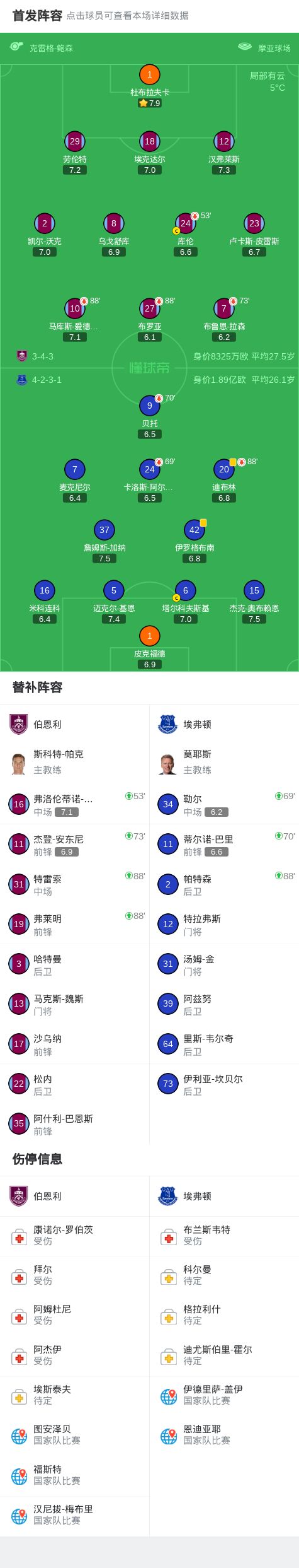 北京时间12月27日英格兰足球顶级联赛 联赛 第18轮,伯恩利主场对阵埃弗顿。上半场双方互有攻防,但都未能攻破对方球门。下半场,贝托脚后跟射门、阿尔卡拉斯倒钩射门均被杜布拉夫卡神奇化解。比赛尾声,杰登-安东尼送出斜塞,弗莱明推射击中立柱弹出,错失绝杀的机会。最终,伯恩利0-0战平埃弗顿。